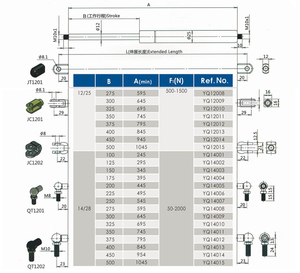 注:由于氣彈簧是非標準的,以上僅為型號的一部分。我們可以根據客戶的要求定制。